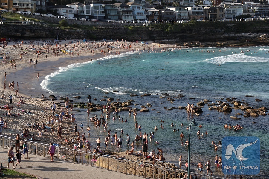 The photo shows people cool themselves at Bronte Beach in Sydney, Australia, on March 18, 2018. (Xinhua/Bai Xuefei)