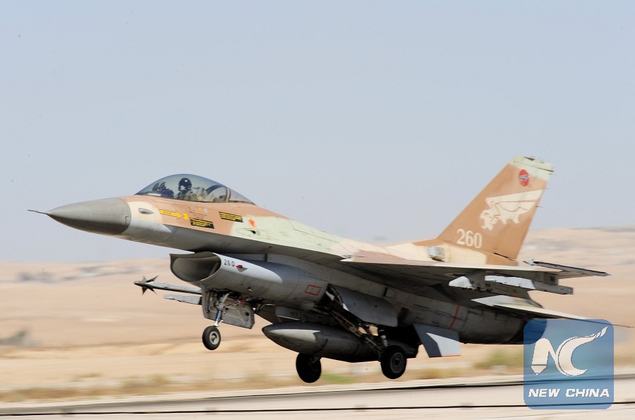 File photo taken on Oct. 6, 2010 shows an F-16 fighter jet of the Israeli Air Force (IAF) taking off at the Nevatim Air Base outside Be'er Sheva in southern Israel. (Xinhua/Yin Dongxun)