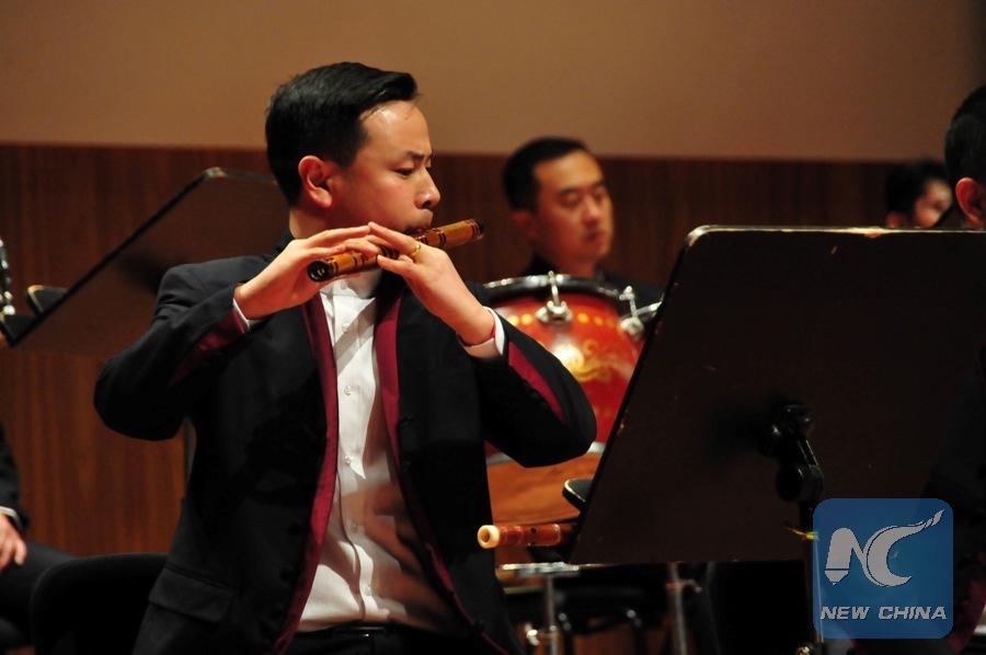 Musician of Gansu Dance Troupe are performing during Chinese New Year's show at the Great Guild Hall in Riga, Latvia on Saturday night, on Jan. 26, 2019. The orchestra of the Gansu Dance Troupe introduced to the Latvian audience Chinese musical traditions by performing Chinese melodies, including Flying Apsaras and the Silk Road, a masterpiece reflecting the profound influences of Chinese dance traditions as well as the history of the region. (Xinhua/Janis Laizans)