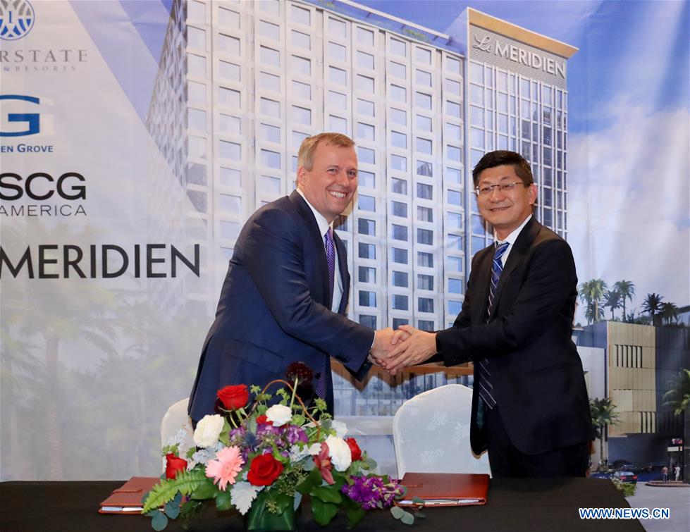 Michael J. Deitemeyer (L), president and CEO of Interstate Hotels & Resorts, shakes hands with Danny Wei, executive vice president of Shanghai Construction Group America (SCGA) , during the signing ceremony of a management agreement for a new hotel project in Los Angeles, the United States, Jan. 30, 2019. The new hotel, located in the city of Garden Grove, 60 km southeast of downtown Los Angeles, will be developed by SCGA, a wholly owned subsidiary of Shanghai Construction Group (SCG) and headquartered in New York City. The construction work on the Le Meridien, designed with a modern twist, is expected to start in the third quarter of 2019 and the hotel to open at the end of 2021. Then Interstate Hotels & Resorts will manage the hotel, which features 400 luxury guest rooms, for the owner SCGA. (Xinhua/Li Ying)