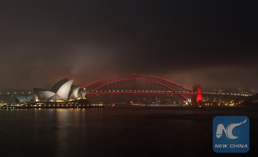 Photo taken on Feb. 1, 2019 shows the Sydney Harbor Bridge, which is lit up in red to celebrate the Chinese Lunar New Year, in Sydney, Australia. (Xinhua/Bai Xuefei)