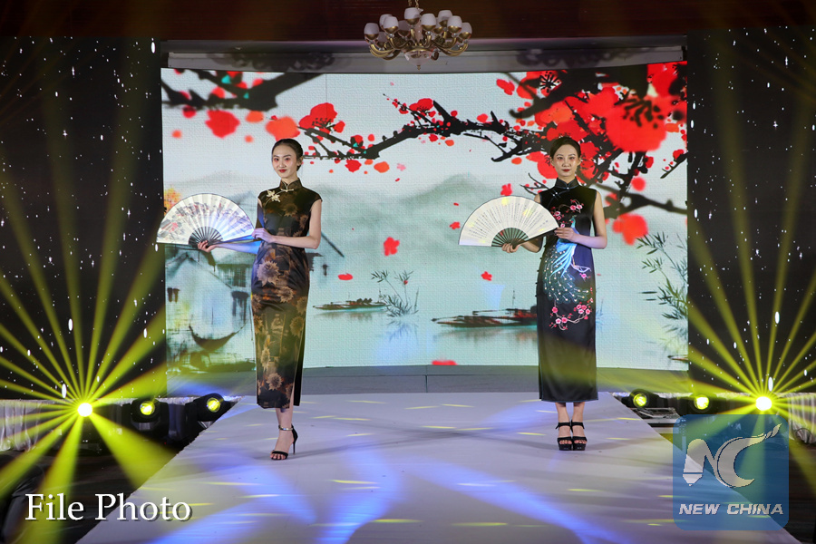 Models present costumes with Chinese characteristics during a fashion show as part of a cultural event entitled "Happy Chinese New Year" in Ulan Bator, Mongolia, Jan. 21, 2019. (Xinhua/Asigang)