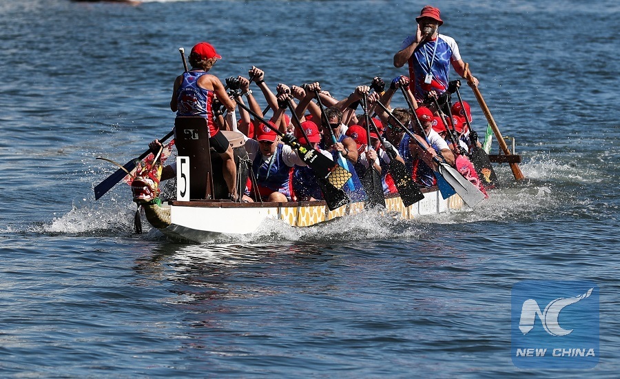 Members of local dragon boat club compete during a dragon boat race at Darling Harbor, Sydney, Australia, Feb. 9, 2019. (Xinhua/Bai Xuefei)