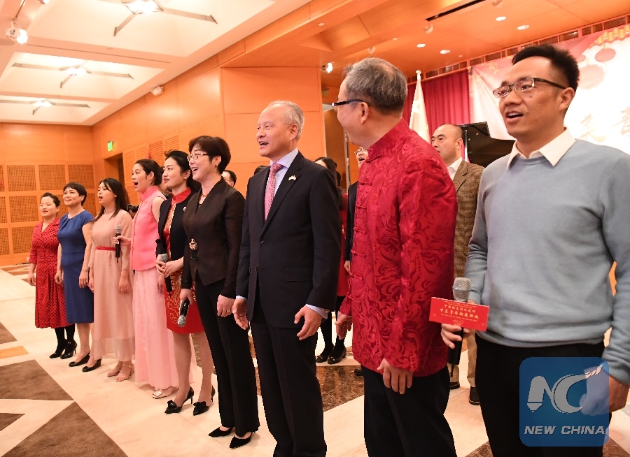 Chinese ambassador to the United States Cui Tiankai (3rd R, front) sings in a flash mob performance at the 2019 New Year Gala for Chinese and American Youth at the Chinese embassy in Washington, the United States, on Feb. 16, 2019. (Xinhua/Liu Jie)