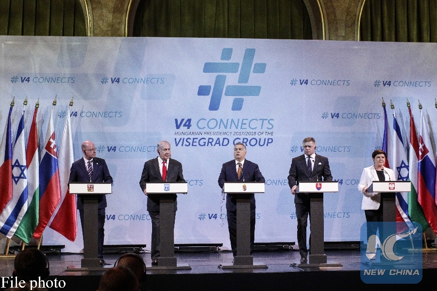(L-R) Czech Prime Minister Bohusalv Sobotka, visiting Israeli Prime Minister Benjamin Netanyahu, Hungarian Prime Minister Viktor Orban, Slovakian Prime Minister Robert Fico and Polish Prime Minister Beata Szydlo attend a joint press conference in Budapest, Hungary on July 19, 2017. (Xinhua/Csaba Domotor)