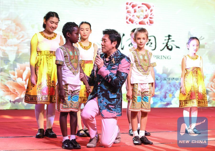 Singer Cai Guoqing(C) reacts with a local child during the "Festival of Spring" gala held in Nairobi, capital of Kenya, Feb. 17, 2019. A grand Spring Festival gala was staged in Nairobi Sunday night for overseas Chinese and locals to celebrate the Chinese Lunar New Year. (Xinhua/Li Yan)