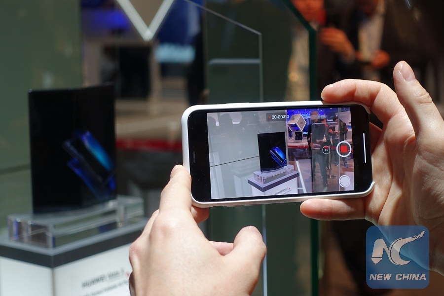 A visitor takes pictures of a Huawei MATE X, a foldable 5G ready smartphone, displayed at the 2019 Mobile World Congress (MWC) in Barcelona, Spain, Feb. 25, 2019. The four-day 2019 MWC opened on Monday in Barcelona. (Xinhua/Guo Qiuda)