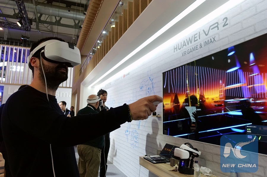 A man plays a VR game of Huawei at the 2019 Mobile World Congress (MWC) in Barcelona, Spain, Feb. 28, 2019. (Xinhua/Guo Qiuda)