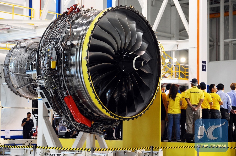 Photo taken on Jan. 20, 2015 shows a Rolls-Royce Trent 1000 aero engine sitting on a platform at the unveiling ceremony in Singapore's Rolls-Royce Seletar Campus, Jan. 20, 2015. (Xinhua/Then Chih Wey)