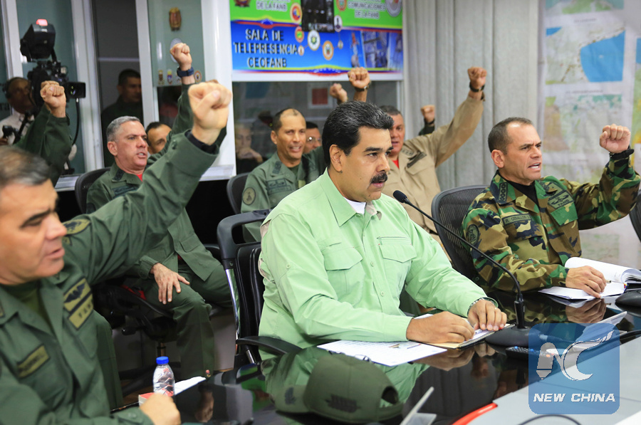 Venezuelan President Nicolas Maduro (C, front) takes part in a meeting with the high command of the National Bolivarian Armed Forces in Caracas Feb. 21, 2019. (Xinhua)