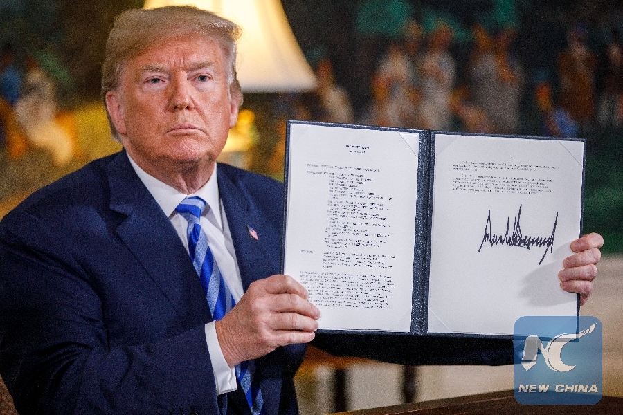 File Photo: U.S. President Donald Trump displays a signed presidential memorandum at the White House in Washington D.C., the United States, on May 8, 2018. U.S. President Donald Trump said the United States will withdraw from the Iran nuclear deal, a landmark agreement signed in 2015. (Xinhua/Ting Shen)