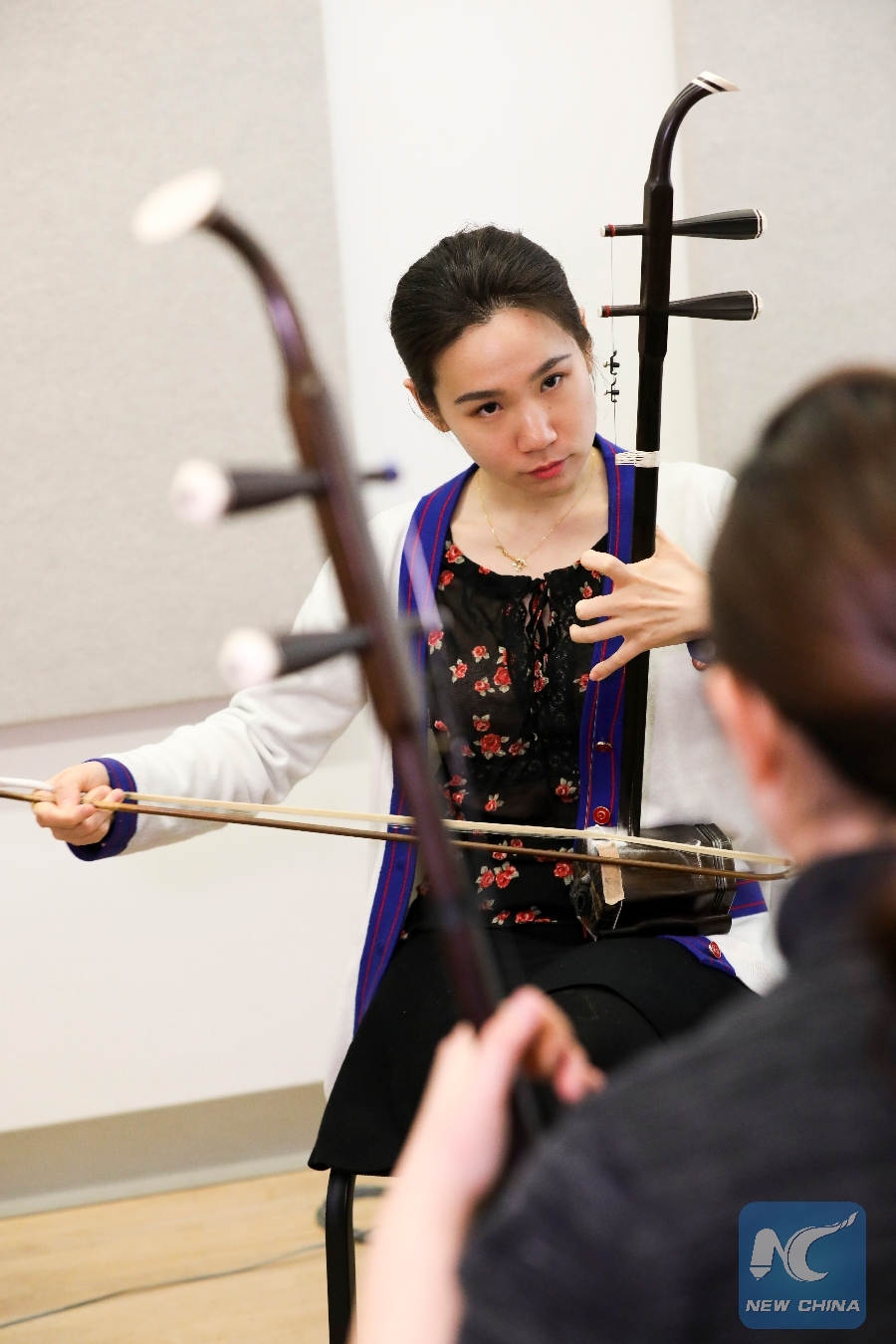 Li Cangxiao (back), an erhu (urheen) teacher in the double degree program of the Bard College Conservatory of Music (BCOM) and its U.S.-China Music Institute, in partnership with the Central Conservatory of Music (CCOM) in Beijing, demonstrates erhu technique for a student, at Bard College in Annandale-on-Hudson, New York, the United States, March 12, 2019. (Xinhua/Zou Guangping)