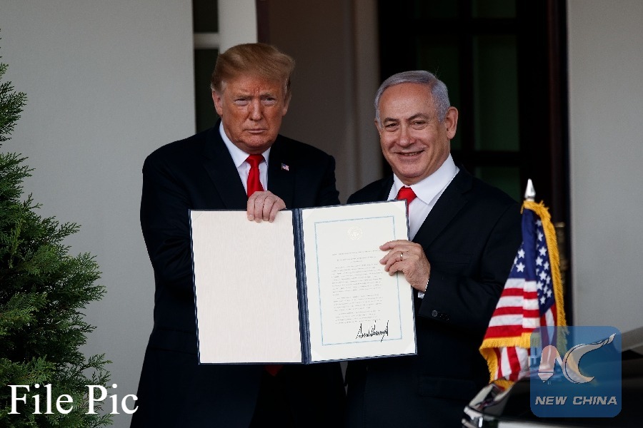 U.S. President Donald Trump (L) and Israeli Prime Minister Benjamin Netanyahu display the proclamation recognizing Israel's sovereignty over the disputed Golan Heights at the White House in Washington D.C., the United States, on March 25, 2019. (Xinhua File photo)