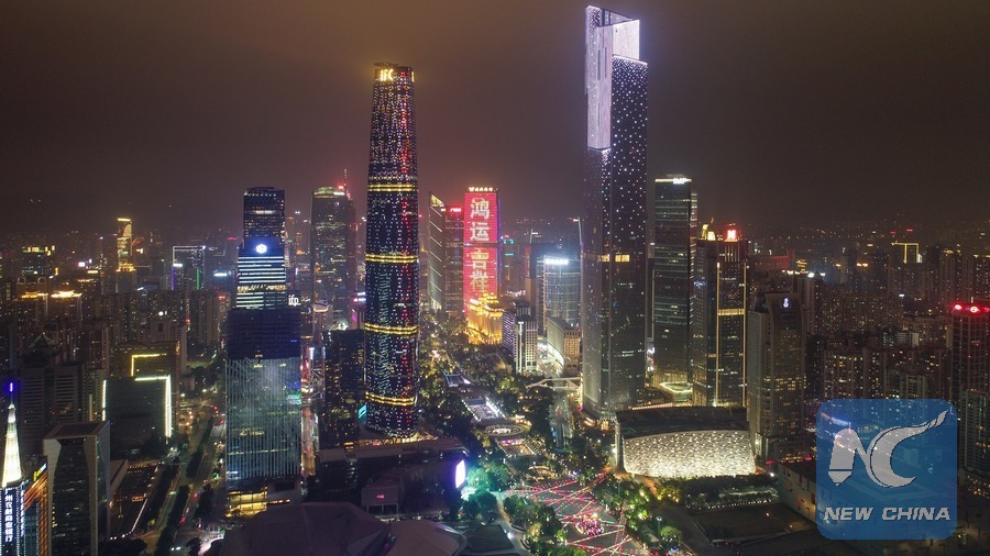 Aerial photo taken on Feb. 12, 2019 shows the night view of the Huacheng Square in Guangzhou, capital of south China's Guangdong Province. Guangzhou set a record for tourists, serving a total of 16.96 million people over this week-long Spring Fesitval holiday. (Xinhua/Liu Dawei)