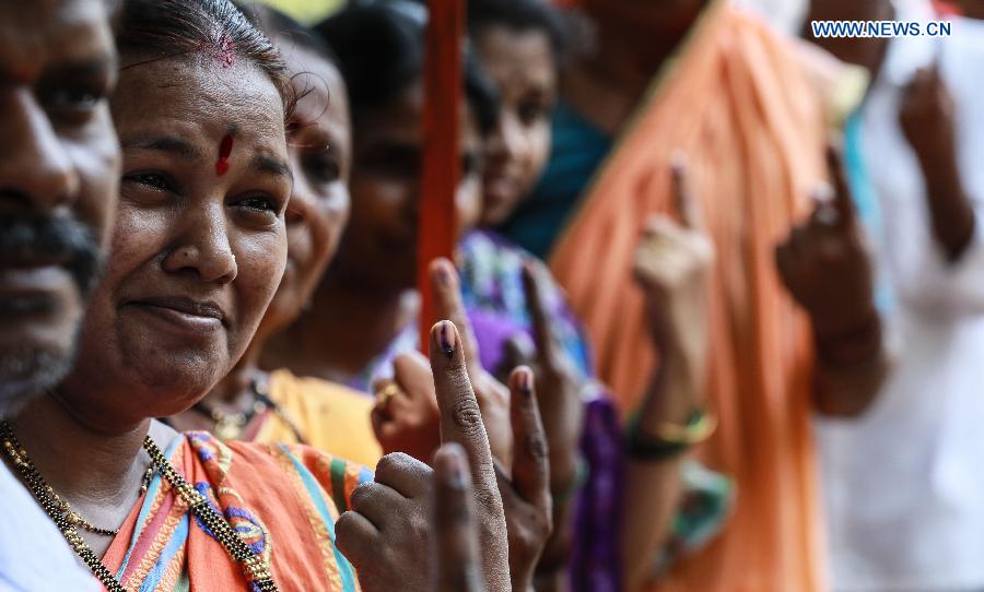Indian voters show their ink-marked fingers after casting votes at a polling station in Mumbai, India, April 29, 2019. (Xinhua/Stringer)
