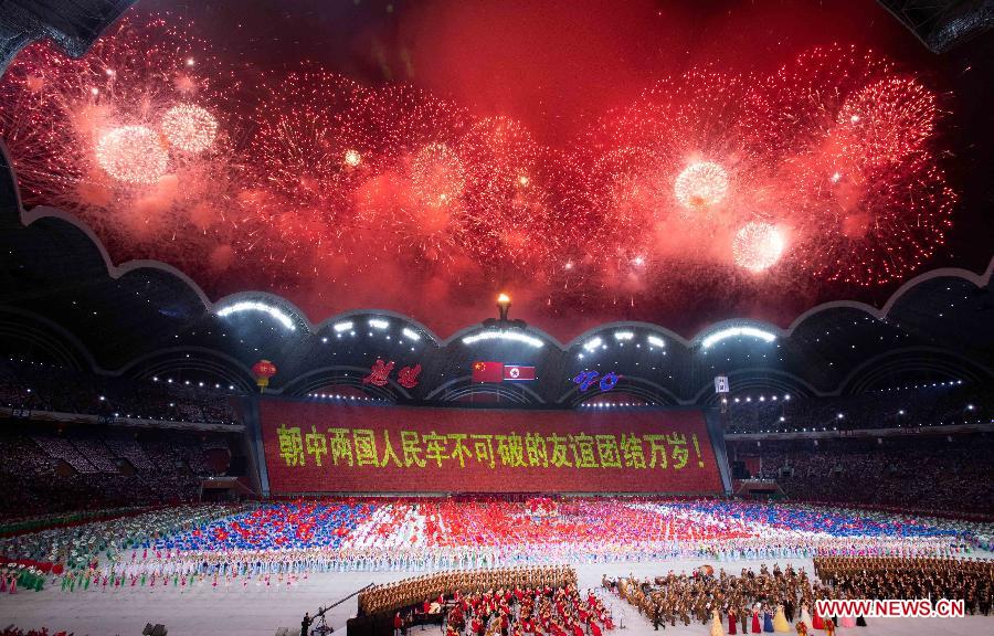 A large group callisthenics and art performance is held at the May Day Stadium in Pyongyang, DPRK, June 20, 2019. Xi Jinping, general secretary of the Central Committee of the Communist Party of China (CPC) and Chinese president, and his wife Peng Liyuan, accompanied by Kim Jong Un, chairman of the Workers' Party of Korea (WPK) and chairman of the State Affairs Commission of the Democratic People's Republic of Korea (DPRK) and his wife Ri Sol Ju, watched the perfromance here on Thursday. (Xinhua/Shen Hong)