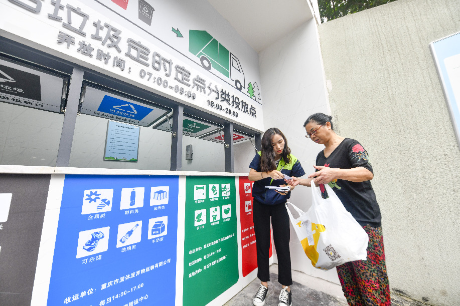 Garbage classification inspector of Chongqing Environment & Sanitation Group Lu Xing (L) provides consultation service of garbage classification to a resident at a community in Jiulongpo District in Chongqing, southwest China, June 27, 2019. (Xinhua)