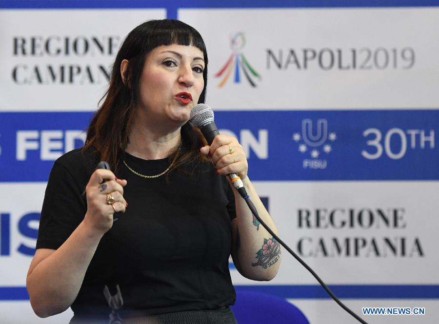 Stefania Opipari, director of closing ceremony addresses a press conference for the 30th Summer Universiade in Naples, Italy, on July 1, 2019. The 30th Summer Universiade will kick off on July 3 in Naples. (Xinhua/Kong Hui)