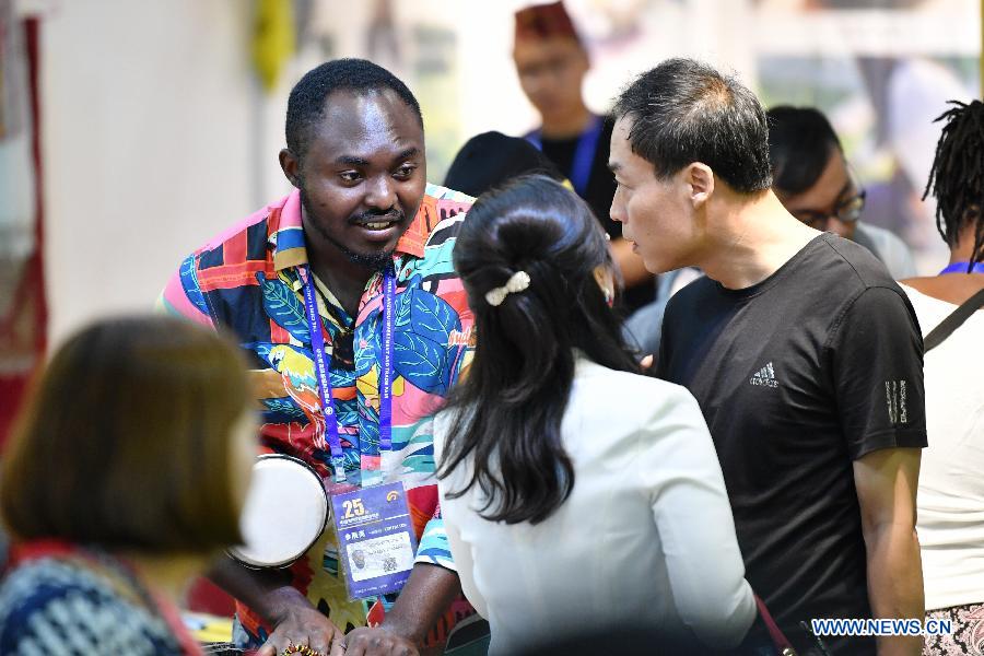 A Ghanaian exhibitor exchanges with guests during the Lanzhou Investment & Trade Fair in Lanzhou, capital of northwest China's Gansu Province, July 4, 2019. The fair opened here on Thursday, and will last for five days. (Xinhua/Chen Bin)