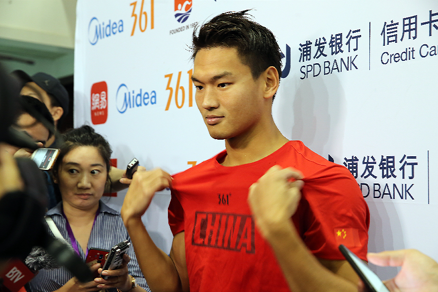 Chinese swimmer Xu Jiayu talking about his expectation at the Swimming Worlds on a training session in Beijing on July 8, 2019. (Xinhua/Li Ying)