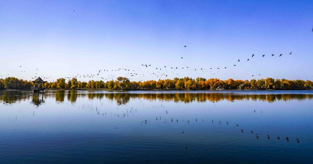 Birds fly over a stretch of desert poplars in Luntai County, northwest China's Xinjiang Uygur Autonomous Region, Oct. 25, 2018. (Xinhua/Zhao Ge)