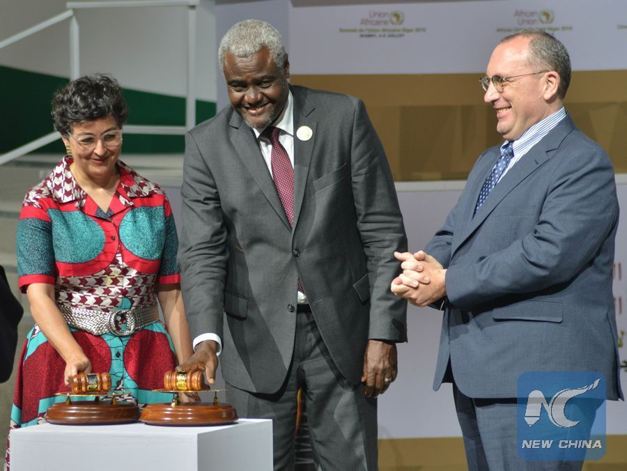 Chairperson of the African Union (AU) Commission Moussa Faki Mahamat (C) announces the operational phase of the African Continental Free Trade Area (AfCFTA) Agreement during the launching ceremony in Niamey, capital of Niger, July 7, 2019. (Str/Xinhua)