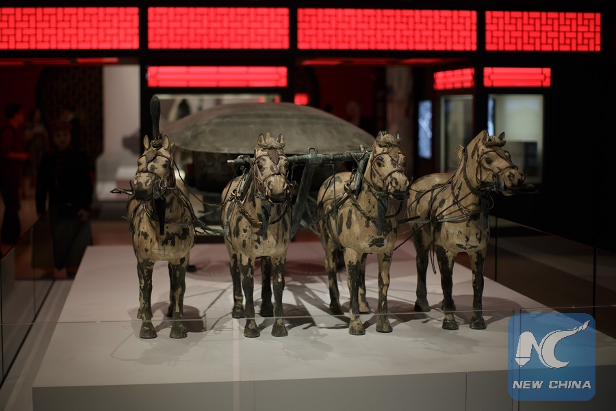 A bronze replica of the Emperor's chariot is seen during a reception ahead of the opening of the exhibition "China's First Emperor and the Terracotta Warriors" at the World Museum in Liverpool, Britain, on Feb. 8, 2018. (Xinhua/Tim Ireland)