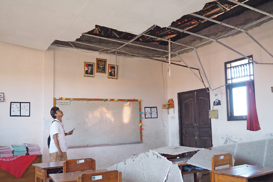 An elementary school teacher examines a damaged classroom after an earthquake in Nusa Dua, Bali, Indonesia, July 16, 2019. An earthquake of 6.0 magnitude struck off Indonesia's Bali Island earlier on Tuesday but there was no potential for tsunami, the meteorology and geophysics agency said. (Xinhua/Monstar Simanjuntak)