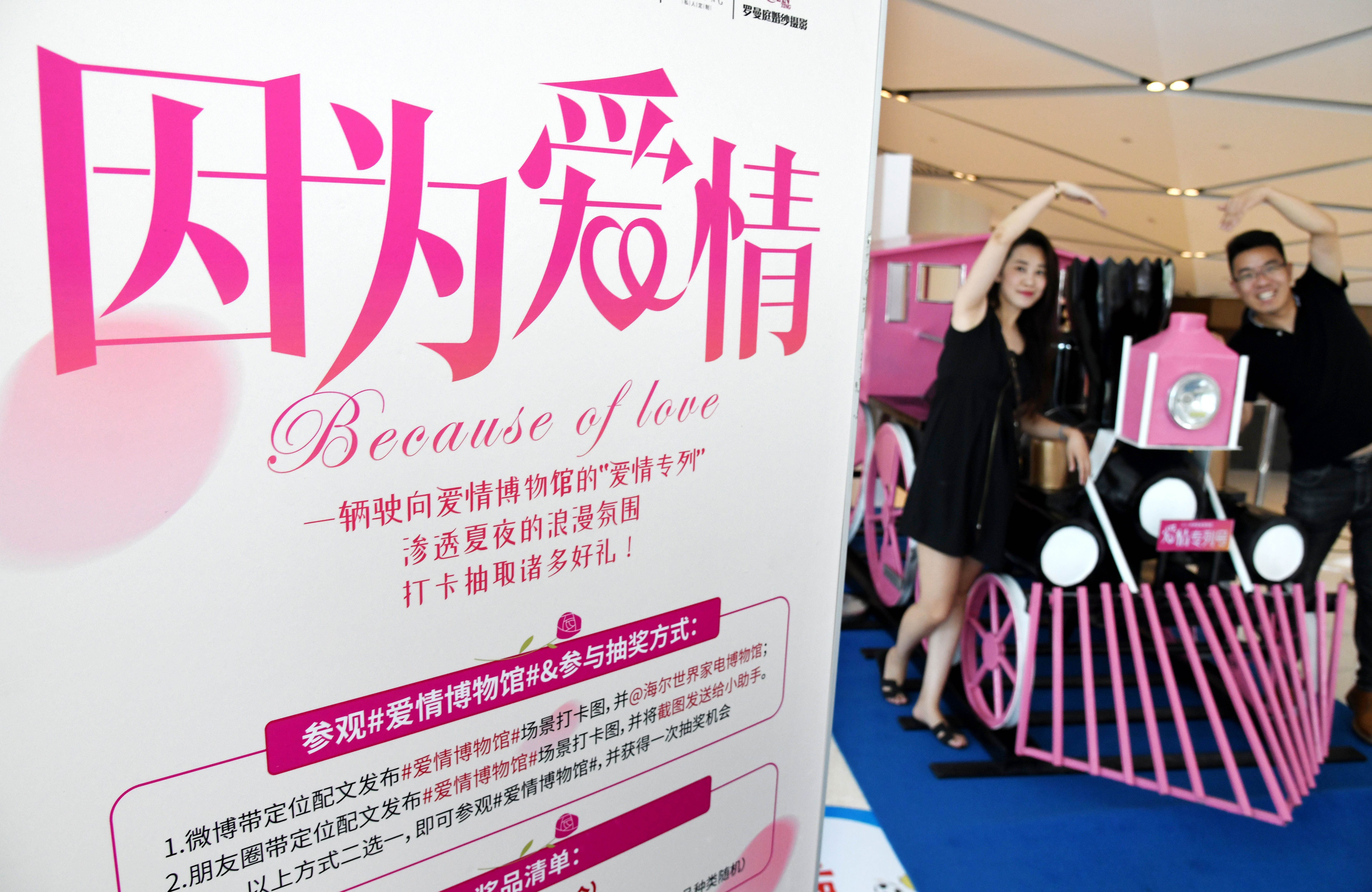 Visitors pose for a photo at a love-theme exhibition at Haier World Home Appliance Museum on Qixi festival, Chinese Valentine's Day, in Qingdao, east China's Shandong Province, on Aug. 7, 2019, (Xinhua/Li Ziheng)