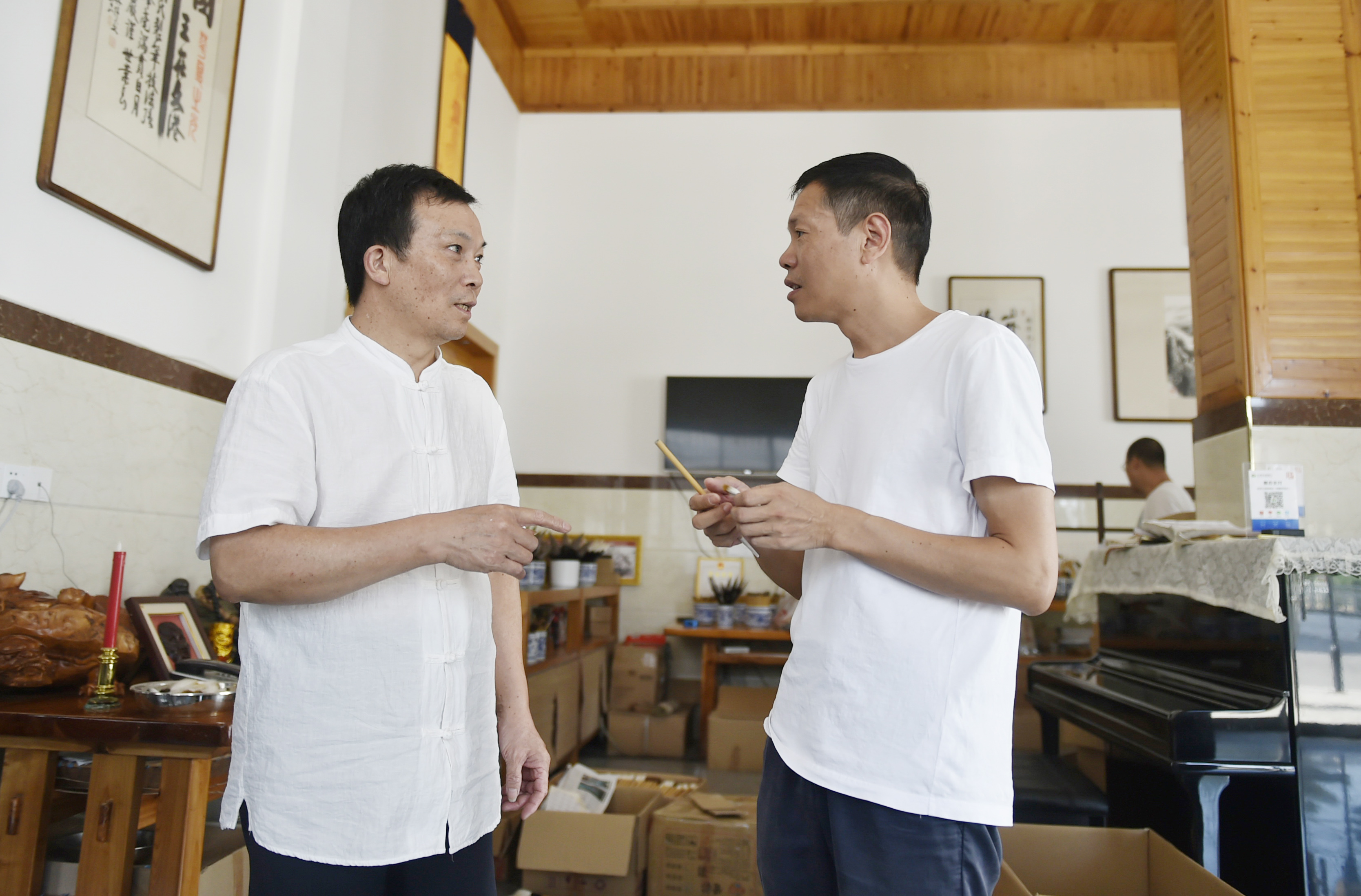 Brush pen craftsman Zhou Pengcheng (L) introduces techniques of making brush pens to a visitor at his workshop in Wengang Township of Jinxian County, east China's Jiangxi Province, Aug. 8, 2019. (Xinhua/Lu Peng)
