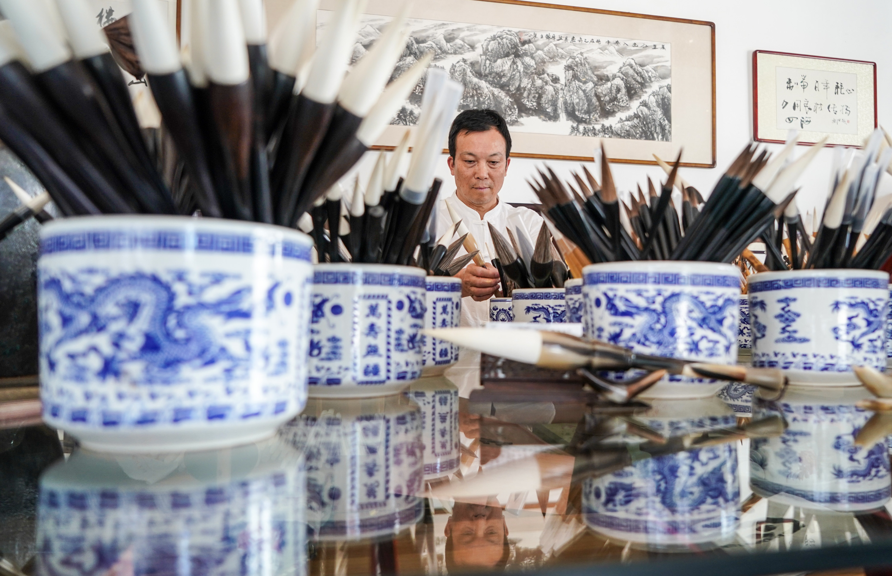 As the inheritor of traditional skills of making Wengang Brush Pen, an intangible cultural heritage of east China's Jiangxi Province, Zhou not only inherited the traditional techniques but also innovated the methods of making brush pen. To better pass on the making techniques of brush pen, Zhou has endeavored to receive and train apprentices and the younger generation of his family.
