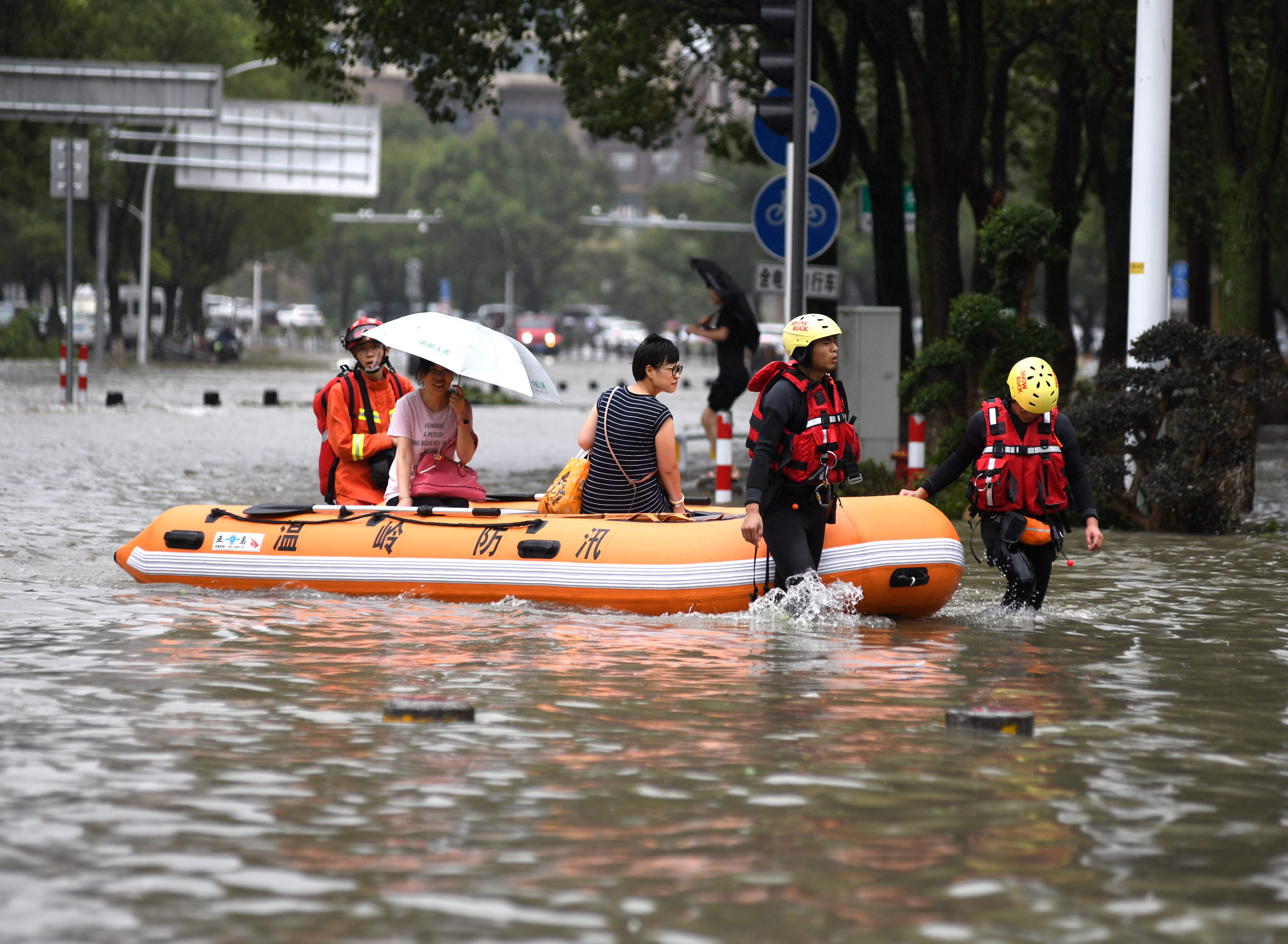 Rescuers transfer the flood-stranded people in Wenling, east China's Zhejiang Province, Aug. 10, 2019. (Photo by Wu Pengfei/Xinhua)