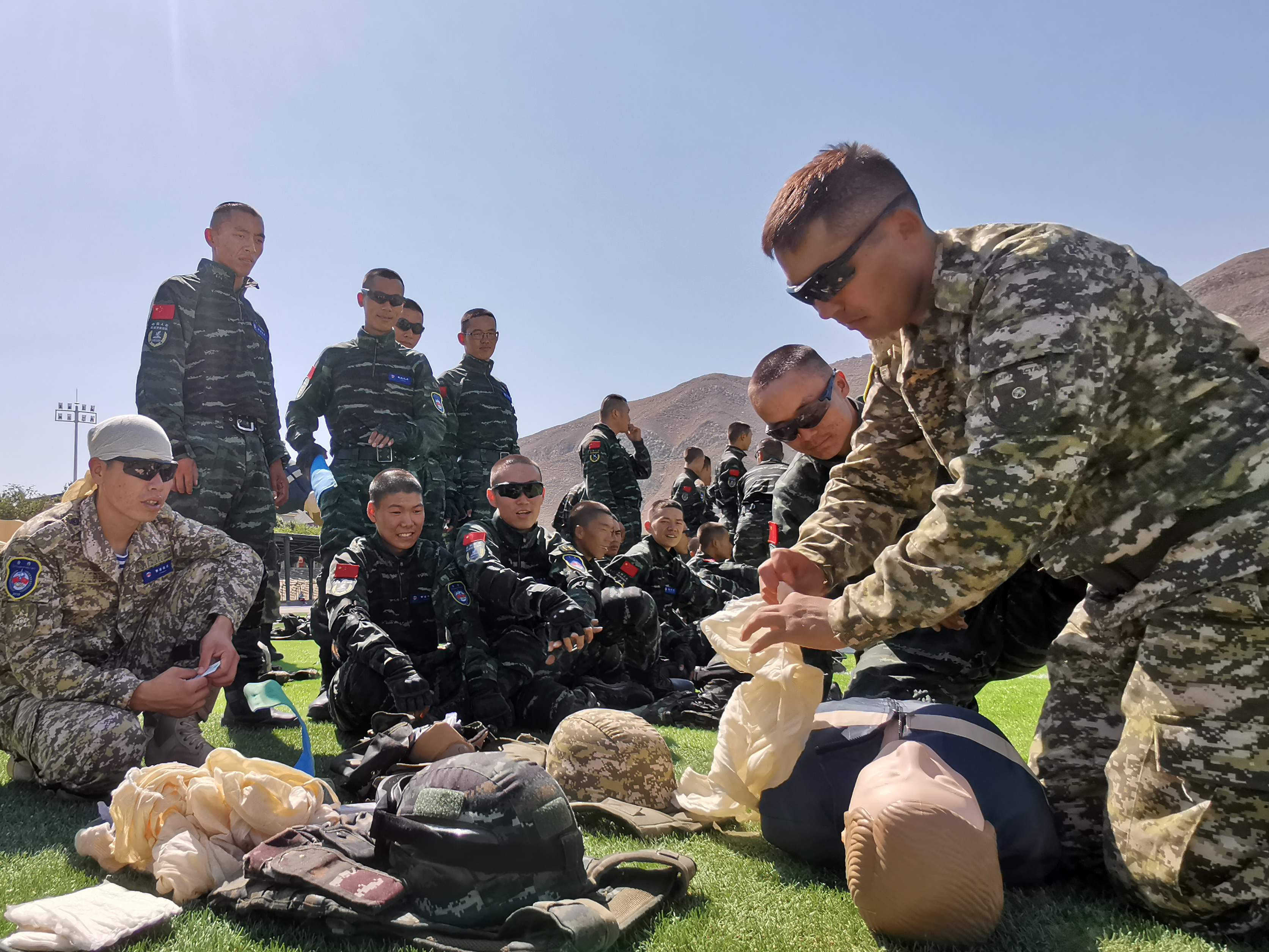 Personnel from the Chinese People's Armed Police Force and the National Guard of Kyrgyzstan take part in battlefield rescue training on Aug. 8, 2019. (Xinhua/Liu Fang)