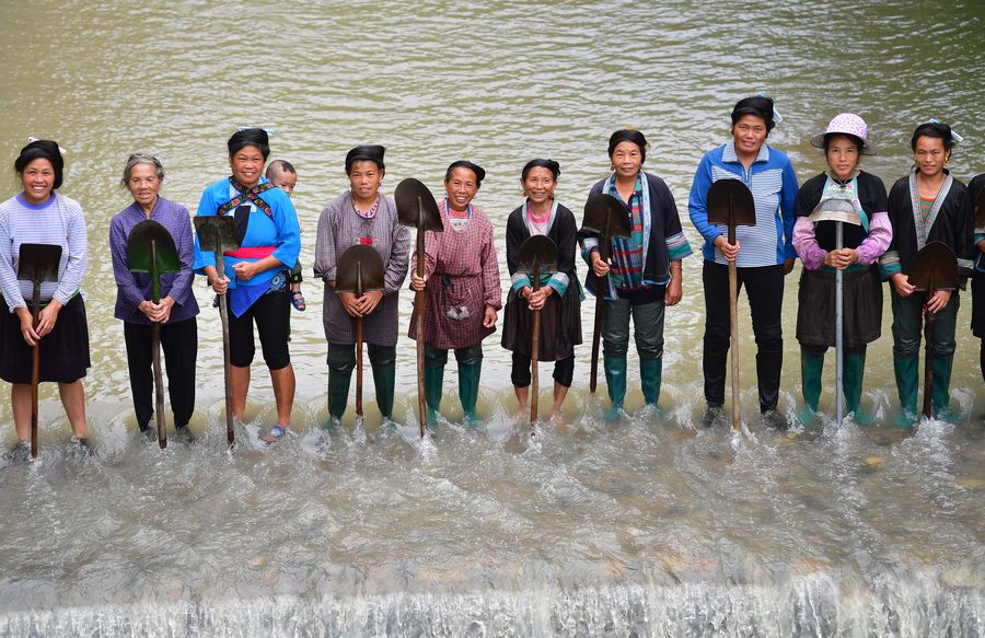 Women participating in construction work of a river dam pose for a group photo in Wuying Village, a Miao village under joint administration of Rongshui County, south China's Guangxi Zhuang Autonomous Region, and Congjiang County, southwest China's Guizhou Province, July 2, 2019. (Xinhua/Huang Xiaobang)