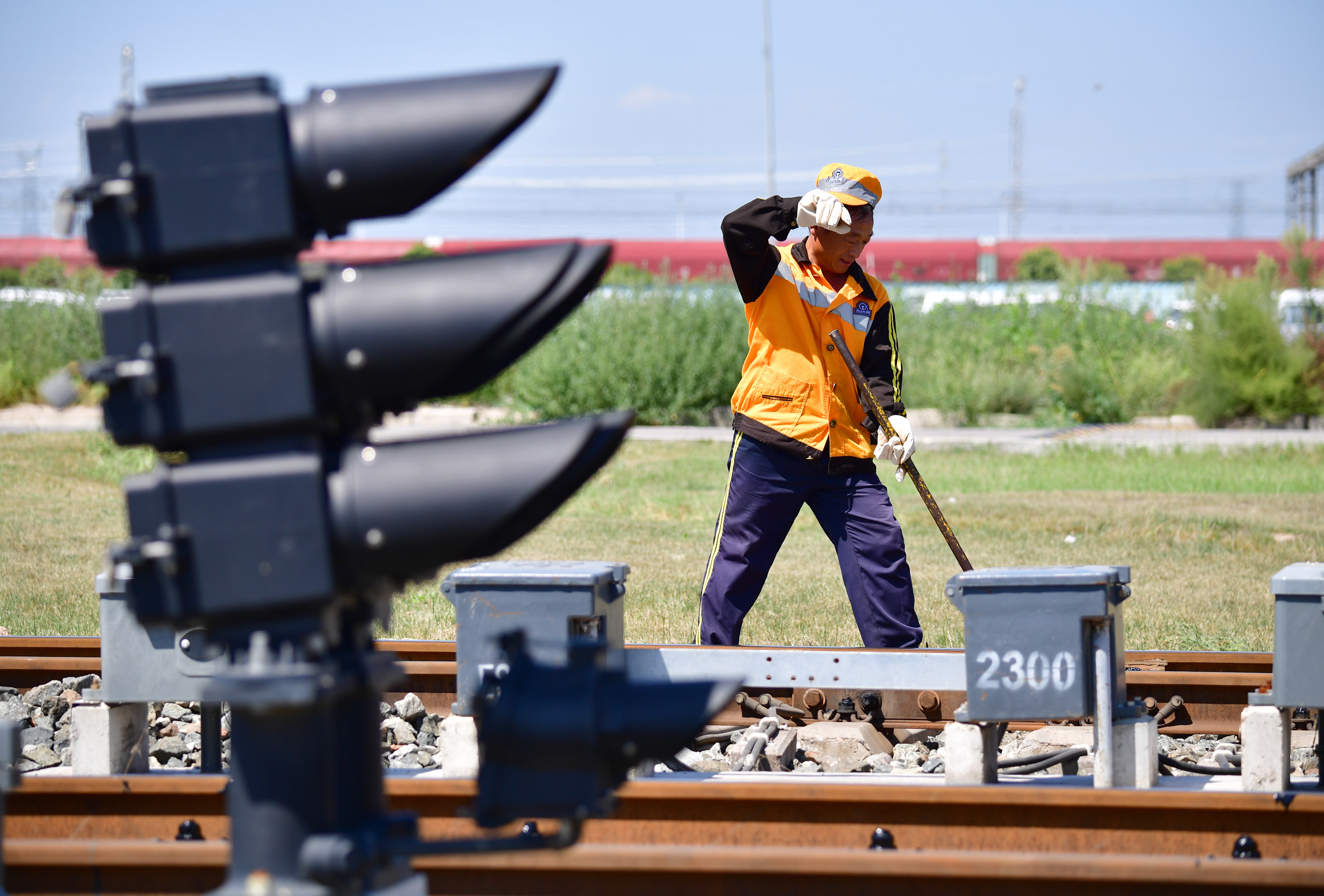 A worker wipes sweat at Xinzhu Railway Station in Xi'an, northwest China's Shaanxi Province Aug. 15, 2019. Workers of Xinzhu Railway Station stick to their posts to guarantee the operation of the trains and the rails despite the high temperature. (Xinhua/Shao Rui)