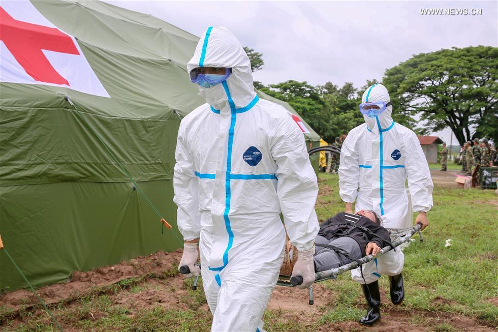 Participants take part in the comprehensive epidemic prevention and control drills during the "Peace Train-2019" China-Laos humanitarian and medical joint rescue exercise in Vientiane, capital of Laos, Aug. 18, 2019. (Xinhua/Xiong Tianze)