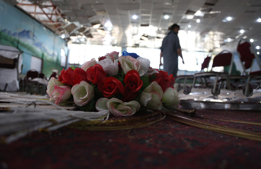 A flower bouquet is seen at a blast site inside Shahr-e-Dubai wedding hall in Kabul, capital of Afghanistan, Aug. 18, 2019. (Xinhua/Rahmatullah Alizadah)