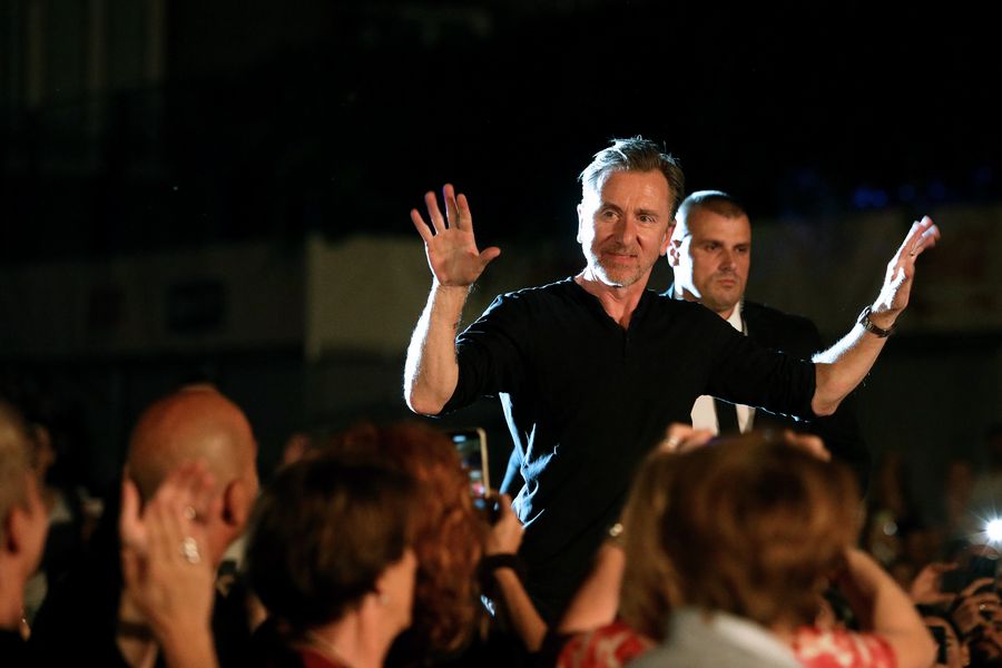 British actor Tim Roth waves to the audience during the Sarajevo Film Festival in Sarajevo, Bosnia and Herzegovina, on Aug. 20, 2019. (Photo by Nedim Grabovica/Xinhua)