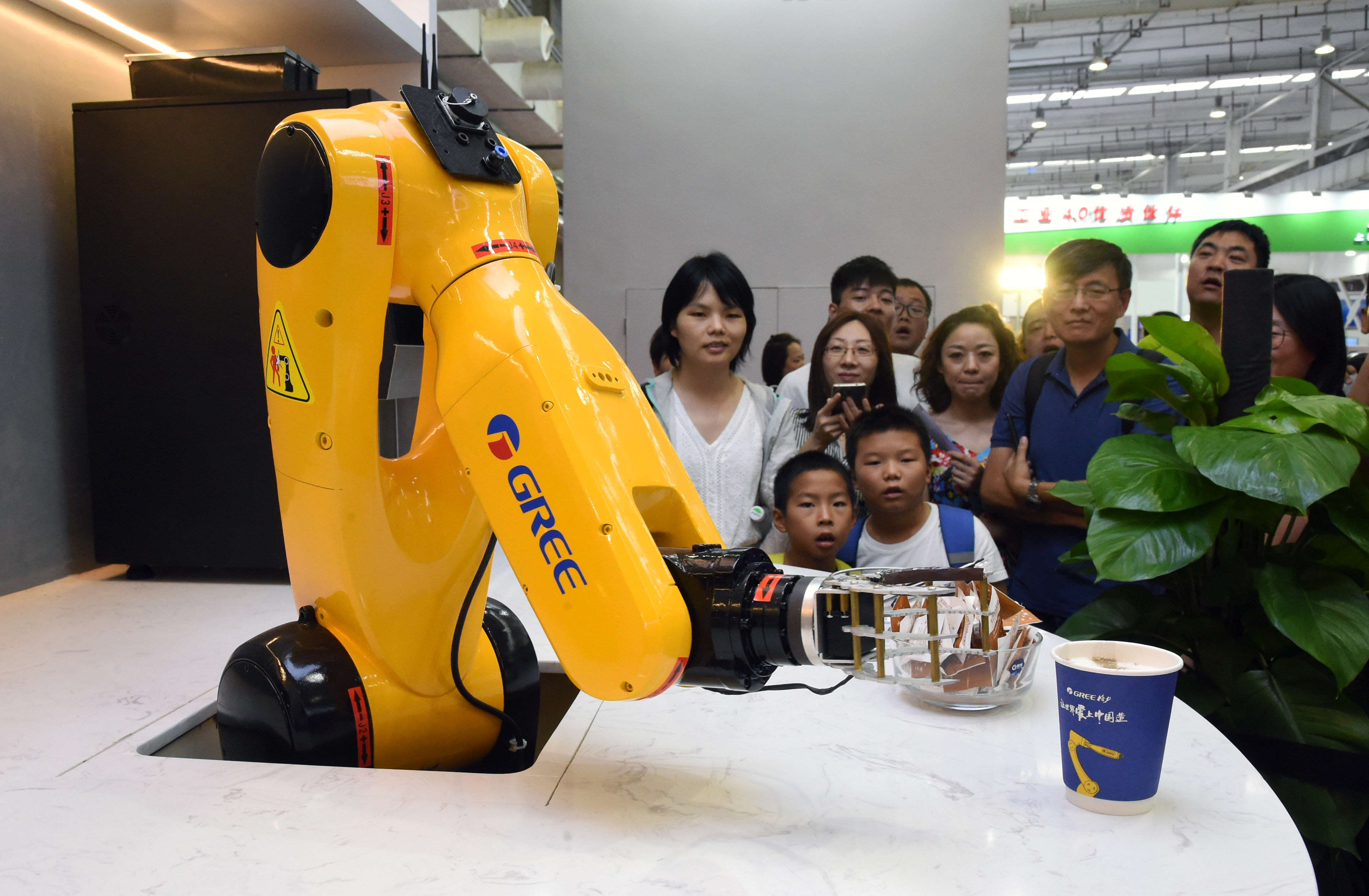 A robot barista, developed by Chinese home appliance producer Gree Electric Appliances, has captivated many visitors at this year's WRC. The bright-colored robotic arm can make and serve coffee and even create latte art.