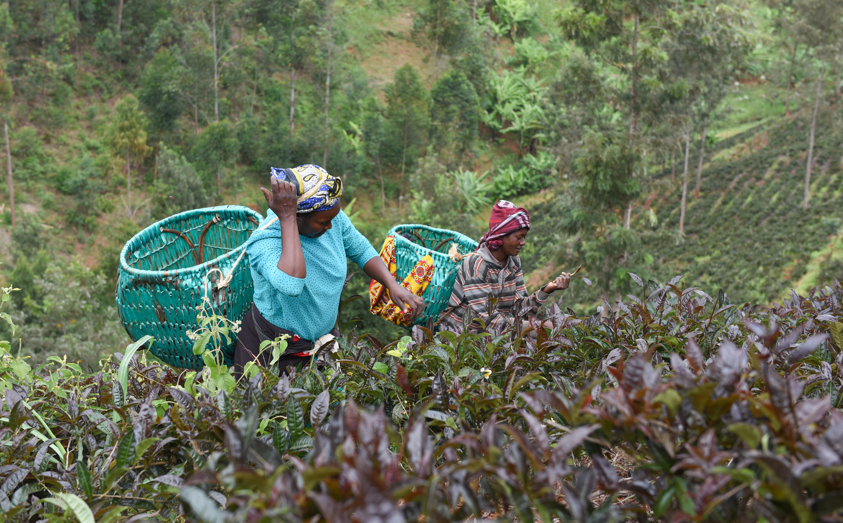 Farmers pick purple tea leaves at a tea garden near Nairobi, capital of Kenya, June 16, 2017. Kenya introduced purple tea about four years ago. (Xinhua/Li Baishun)