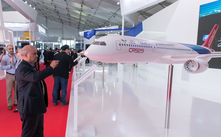 A full-scale model of the long-range wide-body CR929 aircraft jointly developed by China and Russia is being displayed at the exhibition.
