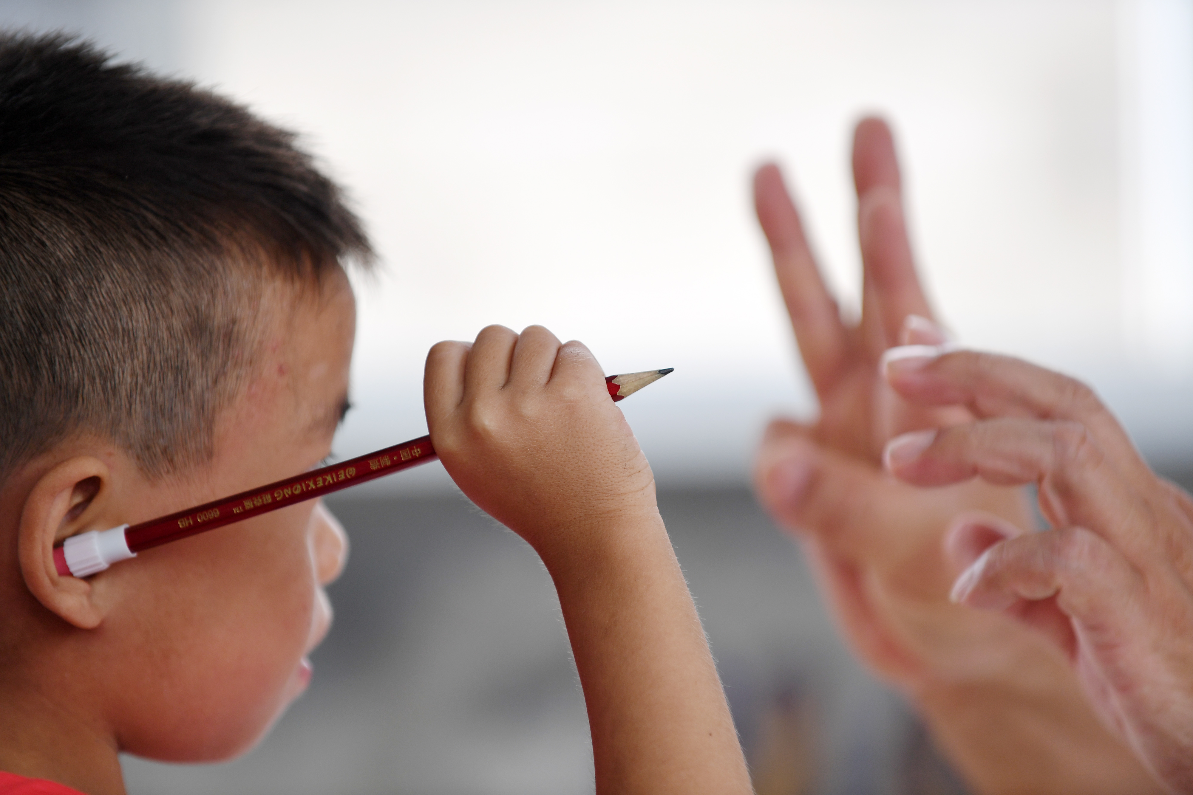 Wu Guoxian teaches drawing to preschool students at Gugang Primary School in Liuguang Village of Longli County in Bouyei-Miao Autonomous Prefecture of Qiannan, southwest China's Guizhou Province, Aug. 27, 2019.(Xinhua/Yang Wenbin)