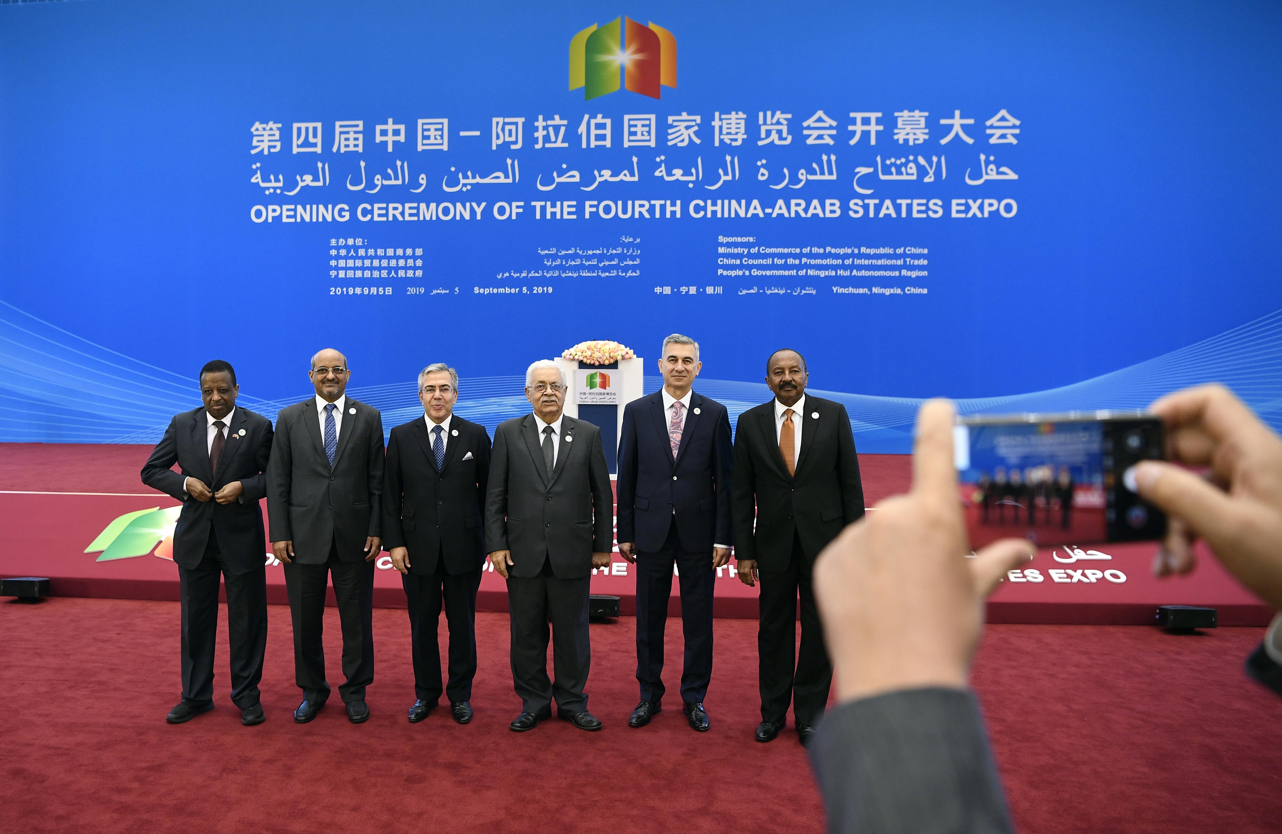 Guests pose for photos during the opening ceremony of the fourth China-Arab States Expo in Yinchuan, capital of northwest China's Ningxia Hui Autonomous Region, Sept. 5, 2019. (Xinhua/Wang Peng)