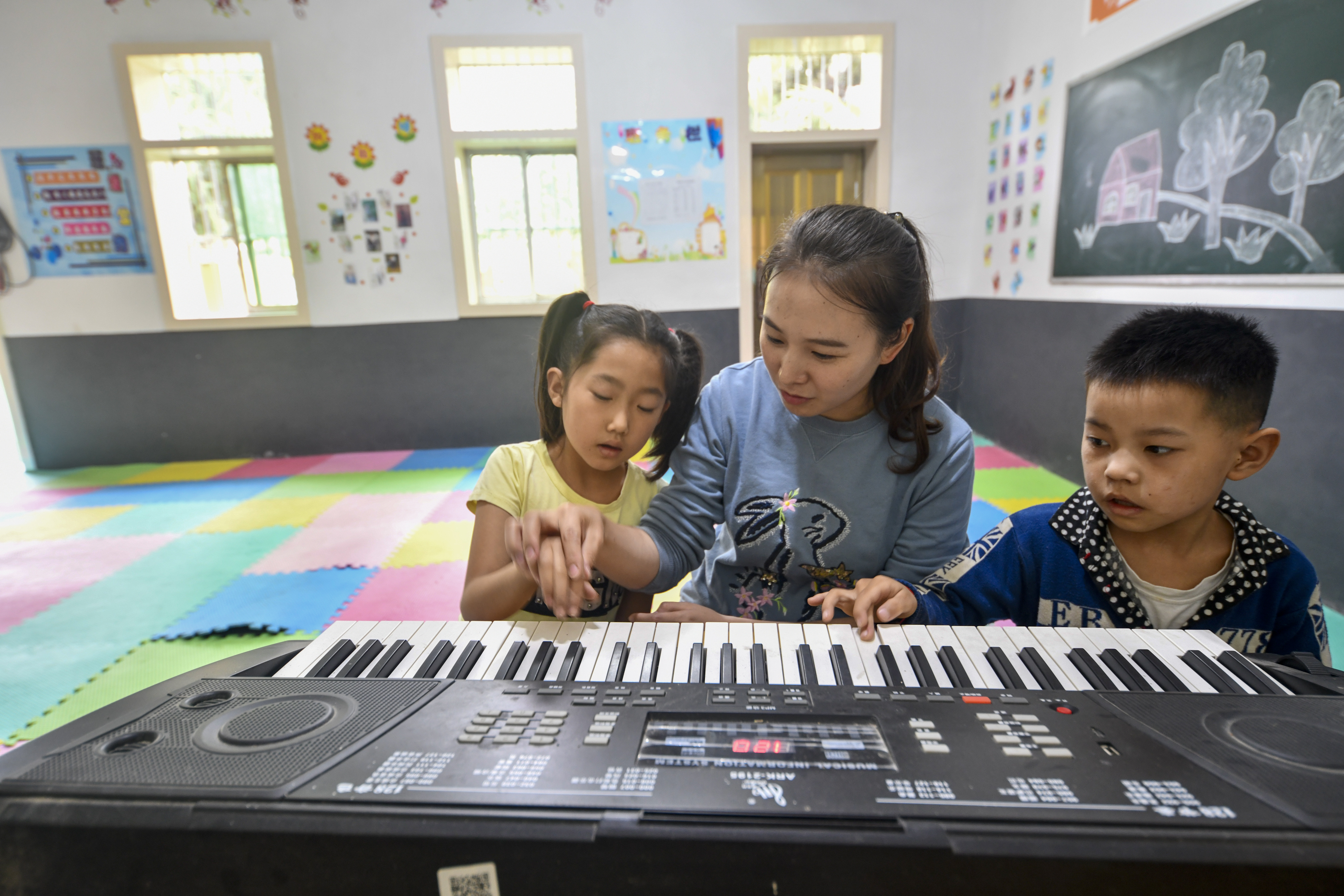 Mu Yi gives a music lesson to students at Lianhua Primary School of Luzi Village, Chengkou County, SW China's Chongqing Municipality. (Xinhua/Liu Chan)