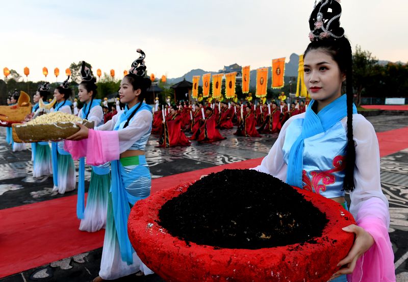 Actors perform during a ceremony praying for harvest of tea at a tea garden in Wuyishan, southeast China's Fujian Province, Sept. 12, 2019. (Xinhua/Zhang Guojun)