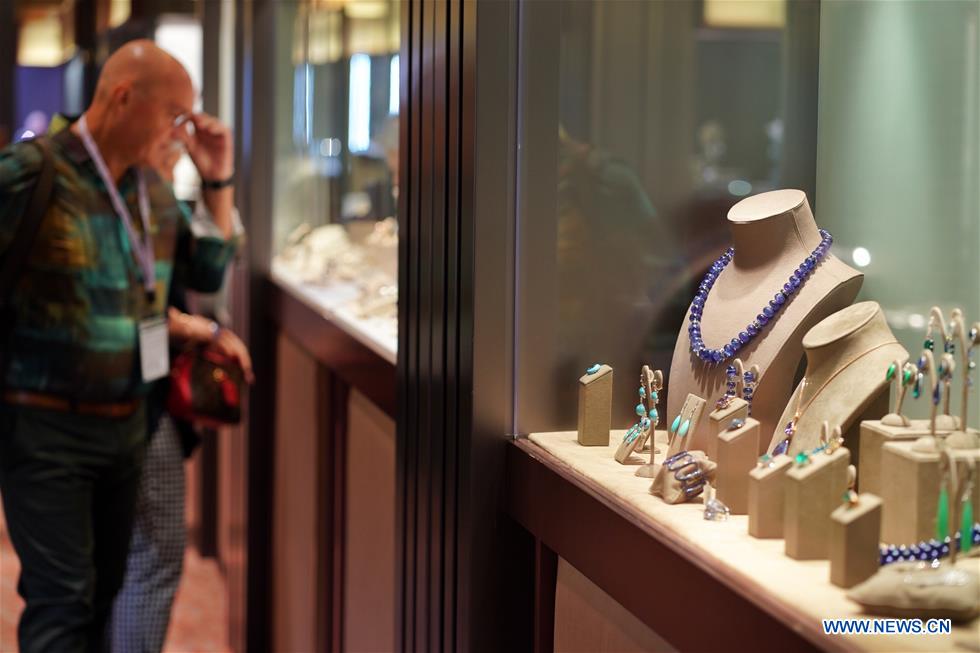 A visitor looks at jewellery exhibited at the September Hong Kong Jewellery & Gem Fair in south China's Hong Kong, Sept. 19, 2019. The fair held from Sept. 18 to 22 at Hong Kong Convention & Exhibition Center has attracted over 3,700 exhibitors from around the world. (Xinhua/Qin Qing)