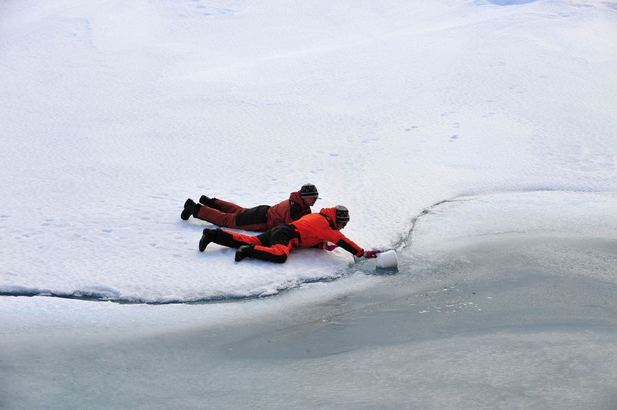 Two members of the fourth Chinese scientific expedition team collect water sample from the melting pond on ice at 88 degrees north latitude, Aug. 20, 2010. (Xinhua/Zhang Jiansong)