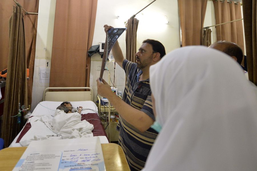 A doctor checks x-ray report of an earthquake victim at a hospital in Mirpur district of Pakistan-controlled Kashmir on Sept. 24, 2019. (Xinhua/Ahmad Kamal)