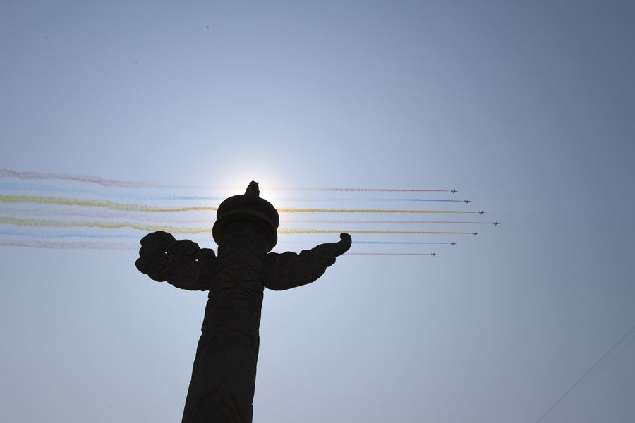 The echelon of trainer aircrafts is seen with the foreground of the Temple of Heaven during a military parade celebrating the 70th founding anniversary of the People's Republic of China (PRC) in Beijing, capital of China, Oct. 1, 2019. (Xinhua/Cao Yang)