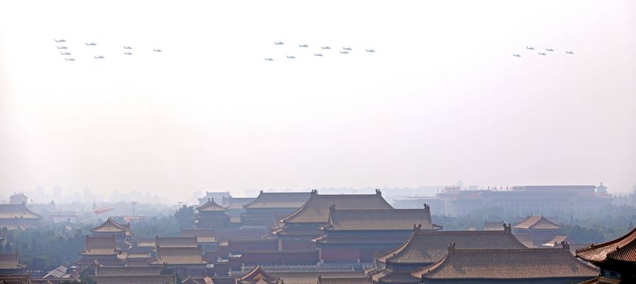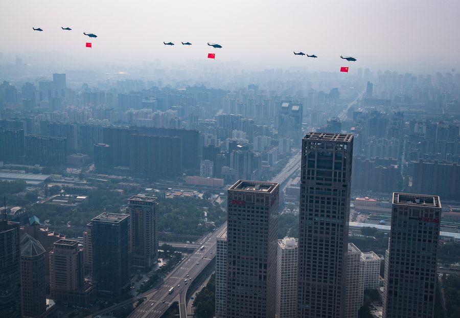 The flag-guarding air echelon takes part in a military parade celebrating the 70th anniversary of the founding of the People's Republic of China (PRC) in Beijing, capital of China, Oct. 1, 2019. (Xinhua/Xiao Yijiu)